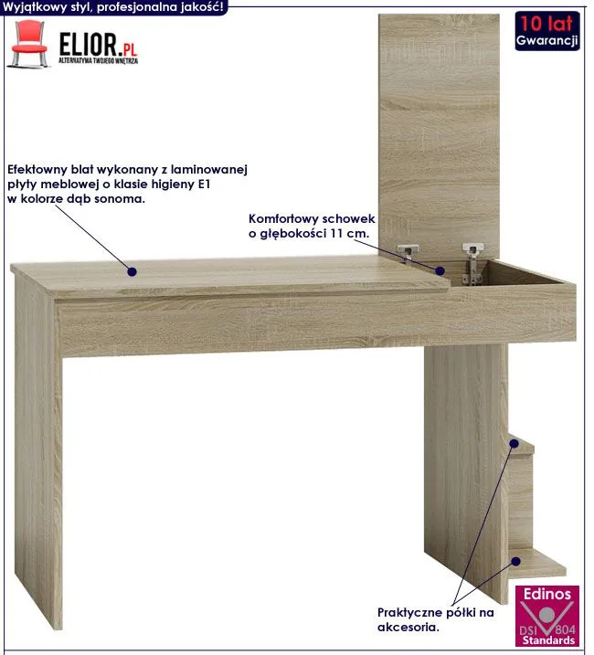 Efektowne biurko Florentino marki Elior to idealna propozycja dla rodziców dbających o wysoki komfort dziecka podczas jego nauki i zabawy przy komputerze. Użyta do produkcji mebla laminowana płyta meblowa w kolorze dąb sonoma została uszlachetniona cienkimi filmami melaminowymi. Posiada także specjalne włókna ułożone różnokierunkowo o strukturze sinusoidalnej, co zapewnia nadanie jej cech jakościowych oraz wytrzymałościowych. Dla zwiększenia wytrzymałości mebla, obrzeża biurka wykończono odpornym na uszkodzenia mechaniczne tworzywem PCV. Praktyczny otwierany schowek o głębokości 11 cm oraz trzy półki na podręczniki i przybory szkolne pozwalają dziecku mieć je zawsze pod ręką. Nie musisz ryzykować nabycia wad postawy spowodowanych użytkowaniem tanich, niedopasowanych mebli. Zadbaj o zdrowie Twoich najbliższych inwestując w wysokiej jakości biurko marki Elior!