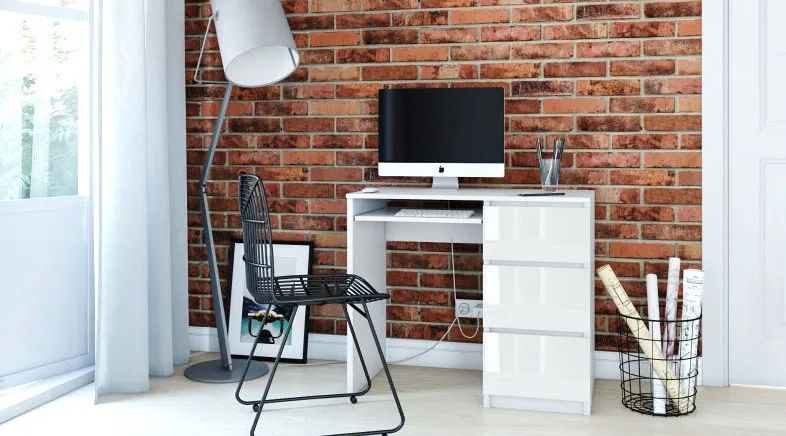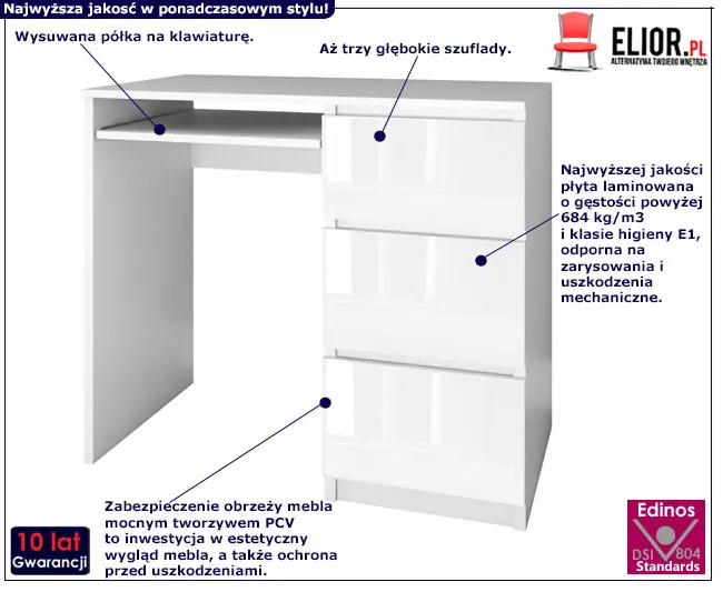 - Modna kolorystyka: Korpus - biały mat, fronty - biały połysk. Kliknij w link i sprawdź także inne białe biurka w sklepie Edinos.pl. Stwórz swój praktyczny zestaw mebli.
