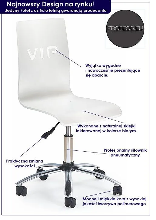 Krzesło wykonane jest z naturalnej sklejki lakierowanej w kolorze białym. Ergonomicznie profilowane we współpracy z europejskimi ortopedami siedzisko oraz oparcie zapewniają komfort pracy nawet przez długie godziny. Nie musisz ryzykować nabycia wad postawy spowodowanych użytkowaniem tanich, chińskich krzeseł. Możesz zainwestować w zdrowie Twoje i Twoich najbliższych inwestując w wysokiej jakości fotel marki Profeos.