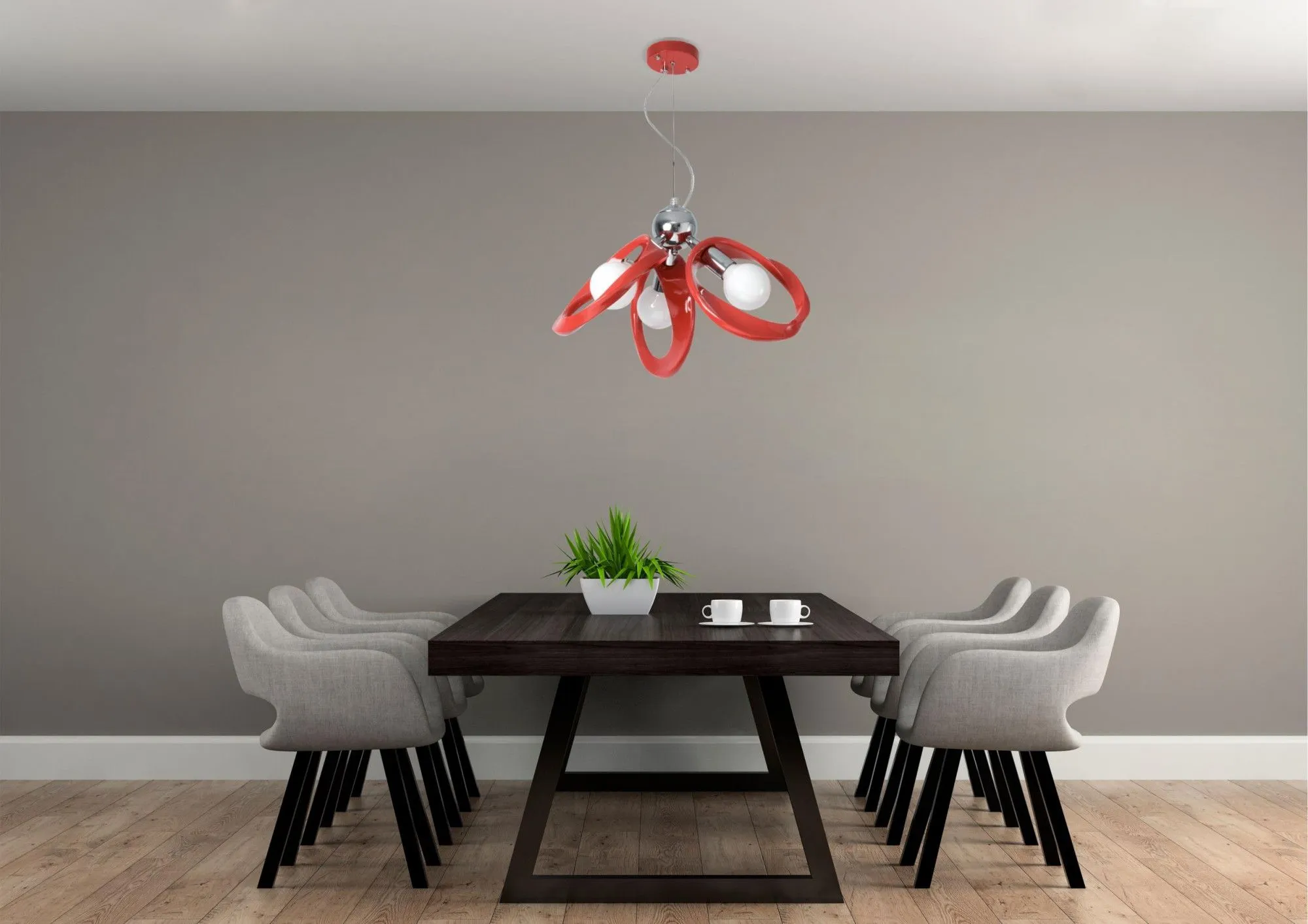 Żyrandol E190-Nildi to nowoczesna i designerska lampa, doskonale podkreślająca wygląd pomieszczenia. Jego czerwone klosze wprowadzą do wystroju wnętrza zarówno dynamikę jak i szczyptę elegancji. Lampa posiada trzy punkty świetlne, przez co doskonale oświetli każde pomieszczenie. Wykonana została z wysokiej jakości materiałów dzięki czemu świetnie się prezentuje, zachowując przy tym walory niezawodności. Szczególnie polecana do nowoczesnych i stylowych wnętrz.