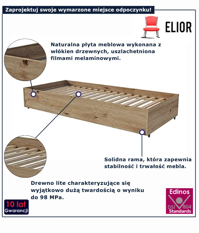 Dzięki zastosowaniu trwałych materiałów i precyzyjnego wykończenia, szuflada Mizz 4X nie tylko świetnie się prezentuje, ale również sprawdza się w codziennym użytkowaniu – bez obaw o szybkie zużycie czy uszkodzenia. To moduł, który znakomicie dopełnia bazę łóżka z kolekcji Mizz, a przy tym sam w sobie stanowi funkcjonalny, estetyczny element wyposażenia. Wybierz szufladę ze stelażem Mizz 4X marki Edinos Premium i przekonaj się, jak łatwo możesz zyskać dodatkowe miejsce – bez rezygnacji z przestrzeni i stylu za jedyne 628 zł. Zadbaj o każdy centymetr swojej sypialni!