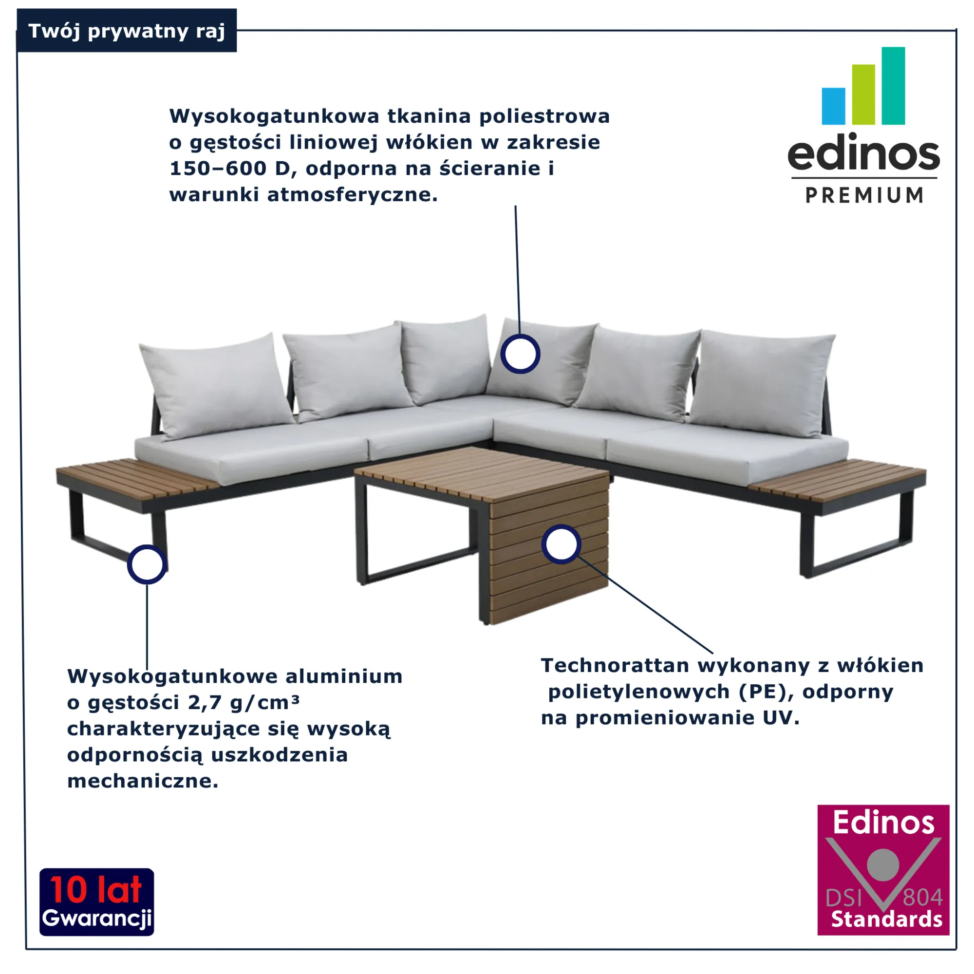 Czas spędzony na świeżym powietrzu potrafi mieć zupełnie inny smak, gdy towarzyszą mu wygodne i stylowe meble. Zestaw mebli Naturino marki Edinos Premium to propozycja dla osób, które chcą stworzyć wokół domu prawdziwą strefę relaksu – miejsce na spokojną kawę o poranku, rozmowy z bliskimi czy wieczorny odpoczynek z książką. Jego przemyślana konstrukcja daje Ci swobodę w aranżowaniu przestrzeni tak, jak naprawdę lubisz. W jednej chwili możesz stworzyć przytulny kącik wypoczynkowy, a innym razem wygodną przestrzeń do spotkań z przyjaciółmi.