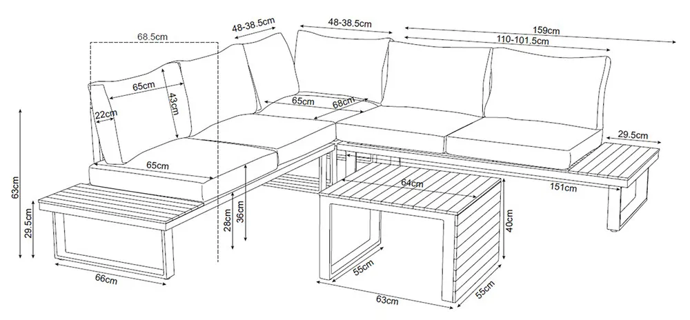 • modułowa konstrukcja pozwalająca swobodnie ustawiać elementy zestawu i dopasować je do wielkości tarasu, ogrodu lub loggii