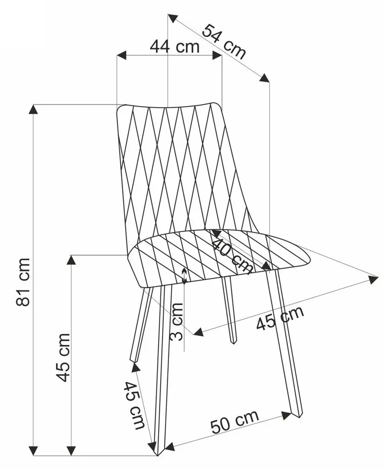 • Wymiary: szerokość: 44 cm, głębokość: 58 cm, wysokość: 85 cm, wysokość siedziska: 47 cm.