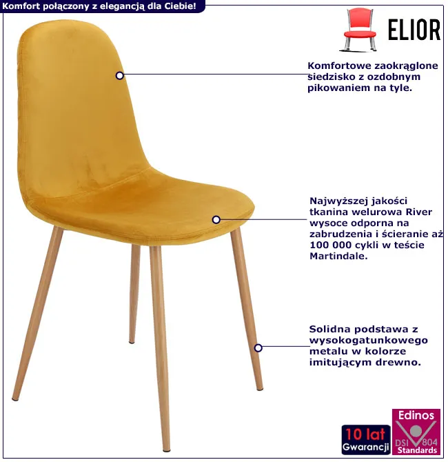 • Estetyka i funkcjonalność w jednym: Metalowe nogi z imitacją drewna tworzą stabilną podstawę i dodają krzesłu eleganckiego wyglądu. Delikatne pikowanie i przeszycia nicią na zewnętrznej stronie siedziska dodają mu charakteru.