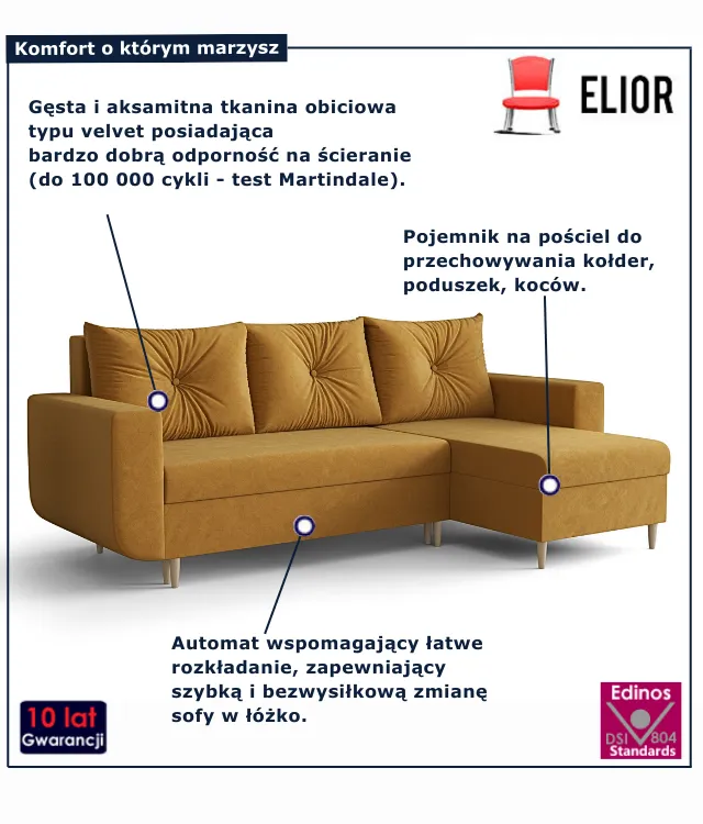 • narożna forma z praktycznym szezlongiem – idealna do wypoczynku i spotkań z bliskimi,
