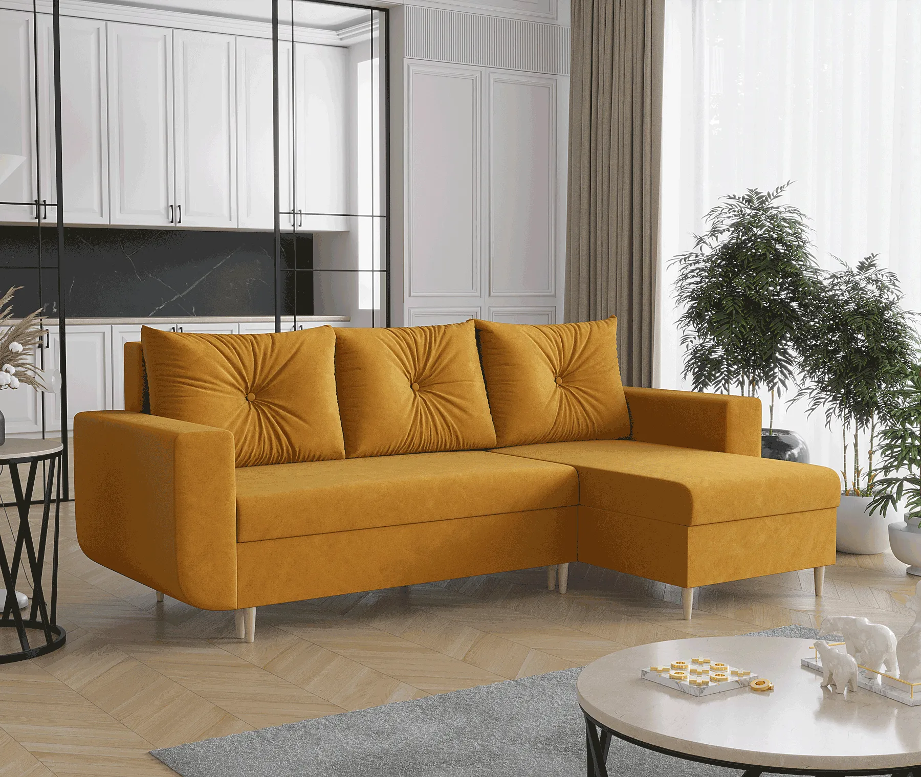 Wizualizacja wnętrza z musztardowym narożnikiem Neravo