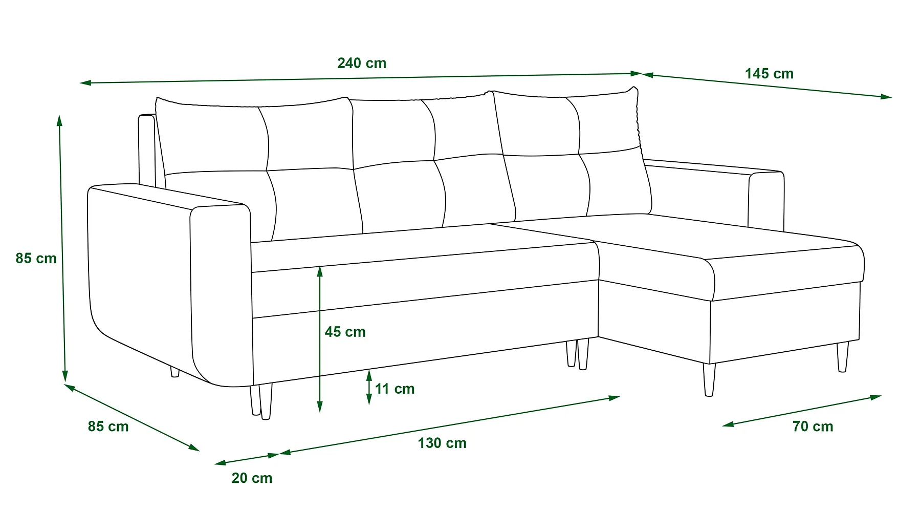 • długość: 145 cm, szerokość: 240 cm, wysokość: 85 cm