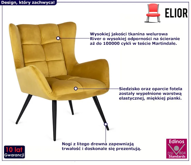 Musztardowy welurowy fotel do salonu Drefo