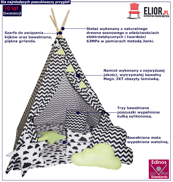 Choć dawniej to indiańskie kobiety były odpowiedzialne za budowę tipi, dziś to nasi projektanci dołożyli wszelkich starań, aby nasz namiot mógł sprawiać radość Twojemu dziecku. Czym się cechuje? Poza spektakularnym designem i maksymalnym komfortem, tipi Mirado może poszczycić się najwyższą jakością wykorzystanych materiałów. To one stanowią o trwałości i bezpieczeństwie. Głównym surowcem, jakiego użyliśmy, jest wysokogatunkowa bawełna Magic 3XT. Jako naturalna tkanina nie uczula i jest niezwykle przewiewna i miękka w dotyku. Wszystkie krawędzie obszyte zostały lamówką, co podnosi walory zarówno estetyczne jak i wytrzymałościowe. Przepiękne, miękkie, bawełniane  poduchy wypełniliśmy kulką sylikonową, a grubą matę - watoliną. Stelaż podtrzymujący namiot wykonany został z naturalnego drewna sosnowego. Jest bardzo wytrzymałe i odporne na uszkodzenia, a ponad to wykazuje właściwości elektrostatyczne. Cechuje się także twardością na poziomie 63 PMa w pomiarach metodą Janki. Nasze tipi jest więc w pełni bezpieczne i przystosowane do potrzeb Twojego dziecka. Najlepsze więc co możesz zrobić, to zainwestować w oryginalny prezent dla swojego malucha i sprawić mu ogromną radość!