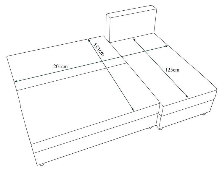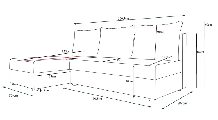 • Wymiary: szerokość całkowita: 201 cm, wysokość: 66/90 cm, głębokość: 140 cm, wysokość siedziska: 40 cm, powierzchnia spania: 130x200 cm.