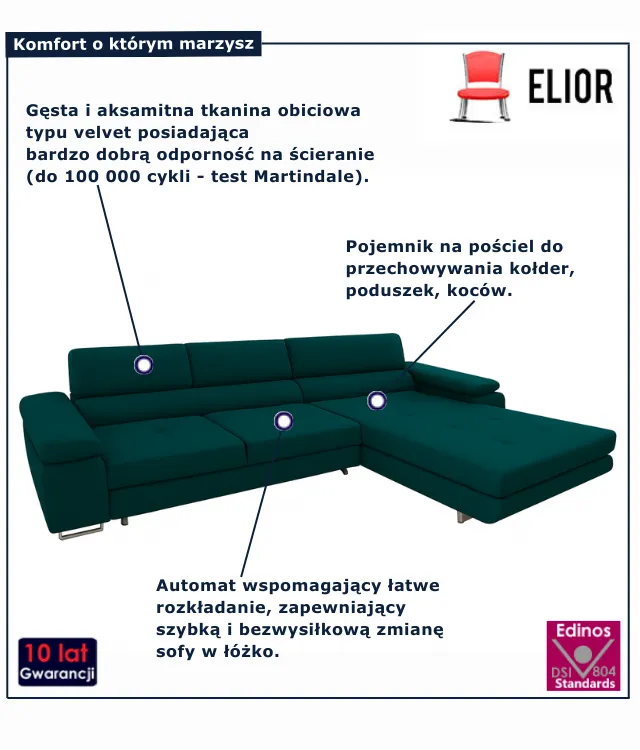 Narożnik Grenvo marki Elior to nie tylko stylowy element wystroju, ale przede wszystkim praktyczne rozwiązanie, które ułatwia codzienne funkcjonowanie. Zyskujesz przestrzeń do relaksu, snu i spotkań z bliskimi, a jednocześnie mebel, który nada Twojemu salonowi wyjątkowego charakteru. Wybierz narożnik Grenvo i ciesz się komfortem każdego dnia w cenie 4338 zł.