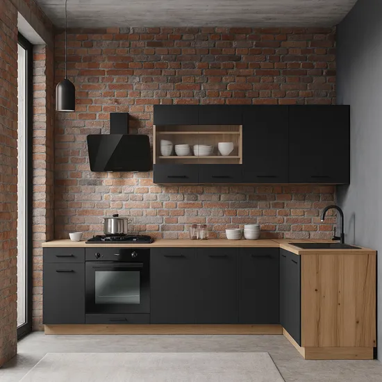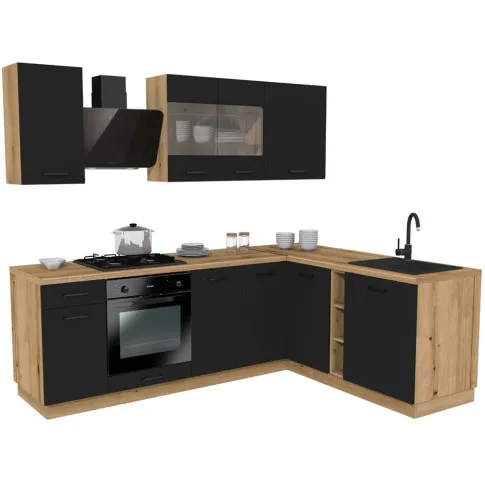 Narożny zestaw mebli kuchennych czarny + dąb evoke - Gurdox