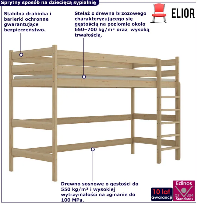 Drewniane sosnowe łóżko na antresoli Jukki