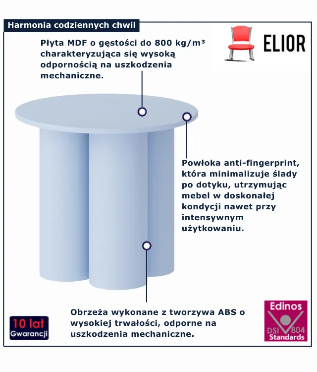• Produkt posiada certyfikat jakości "Edinos Standards DSI 804", który potwierdza najwyższą jakość wykonania mebla oraz pełny stopień zgodności poszczególnych jednostek wytworzonego wyrobu z przyjętym wzorcem.