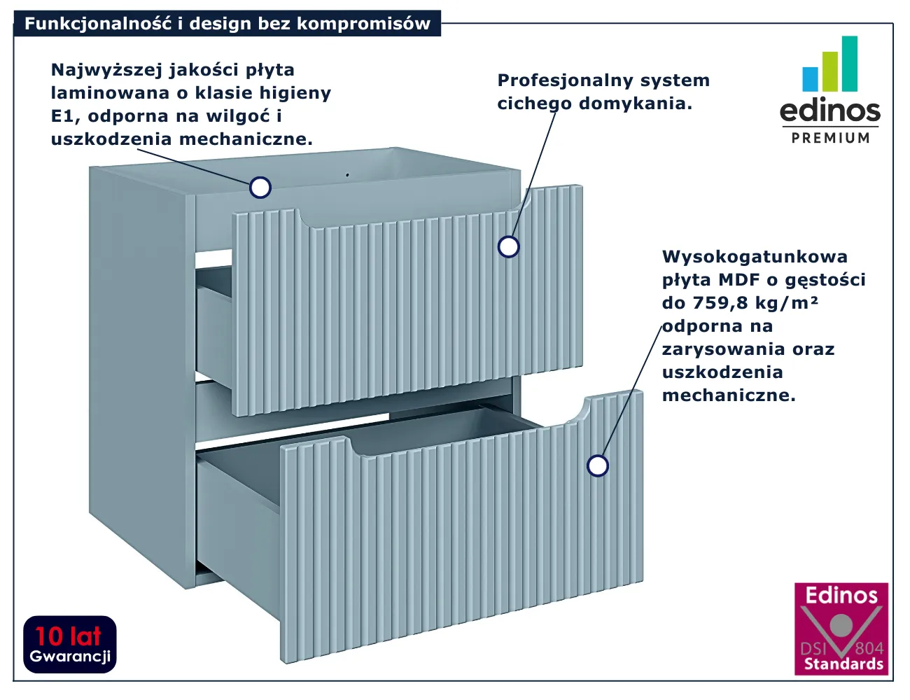 • Produkt posiada certyfikat jakości "Edinos Standards DSI 804", który potwierdza najwyższą jakość wykonania mebla oraz pełny stopień zgodności poszczególnych jednostek wytworzonego wyrobu z przyjętym wzorcem.