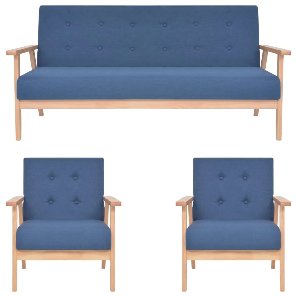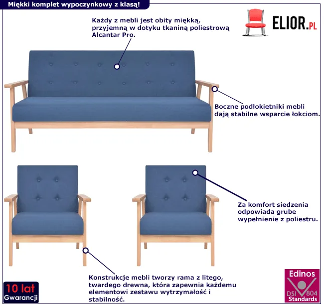 Fotel: - Wymiary: szerokość – 64,5 cm, głębokość – 67 cm, wysokość – 73,5 cm - Szerokość siedziska: 53 cm Sofa 3-osobowa: - Wymiary: szerokość – 158 cm, głębokość – 67 cm, wysokość – 73,5 cm - Szerokość siedziska: 146 cm - Głębokość siedziska: 48 cm - Wysokość siedziska nad ziemią: 37 cm - Wysokość podłokietników nad ziemią: 51 cm - Materiał: drewniana rama i obicie z tkaniny. - Zawartość przesyłki: 2 x fotele, 1 sofa. - Materiał: Tkanina z włókna poliestrowego: 100% - Kolor: niebieski. Kliknij w link sprawdź także inne zestawy wypoczynkowe w sklepie Edinos.pl. Stwórz swój praktyczny zestaw mebli. - Produkt posiada certyfikat jakości "Edinos Standards DSI 804", który potwierdza najwyższą jakość wykonania mebla oraz pełny stopień zgodności poszczególnych jednostek wytworzonego wyrobu z przyjętym wzorcem. - Bardzo łatwy montaż (w zestawie znajduje się czytelna i dokładna instrukcja montażu mebla). - Gwar. 10 lat (inni producenci oferują maksymalnie 24 miesiące gwar. Tylko u nas otrzymujesz pełną jakość potwierdzoną aż 10-letnią gwar.)!