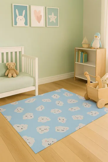 Motyw chmurek jest bardzo dobrze wykonany, nie ma nierówności w nadruku. Dywan dobrze trzyma się podłogi, nie zwija się na brzegach. Nadaje się do codziennego użytkowania i łatwo go utrzymać w czystości.
