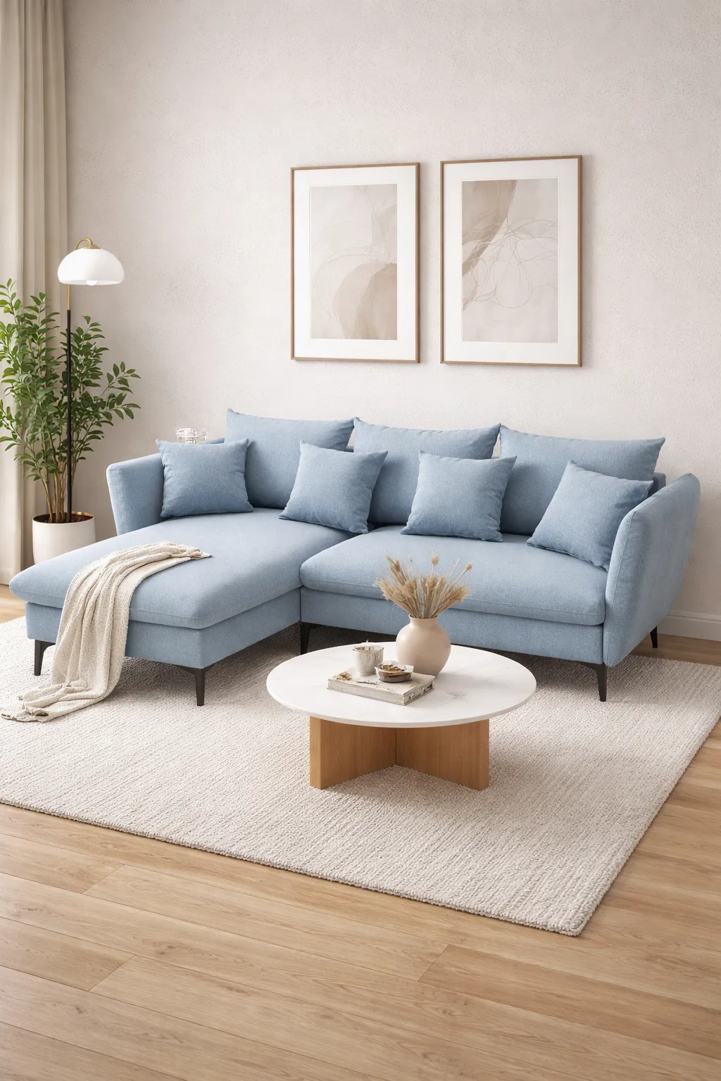 Nowoczesny salon z wykorzystaniem niebieskiego narożnika Pessio 3X