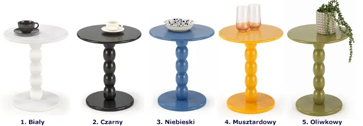 5 modnych kolorów: Biały, Czarny, Niebieski, Musztardowy, Oliwkowy. Sprawdź naszą ofertę i wybierz swoją ulubioną werję kolorystyczną stolika Nebula.