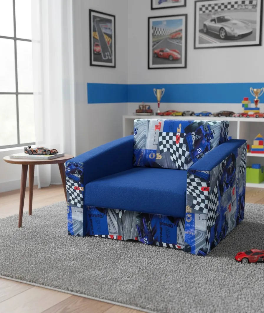 Niebieski rozkładany fotel tapicerowany z motyem F1 - Dorilla 12X