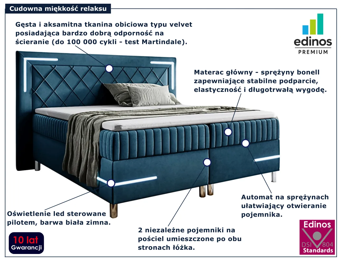 Solterro marki Edinos Premium to łóżko kontynentalne zaprojektowane z myślą o osobach ceniących połączenie nowoczesnego designu z maksymalnym komfortem. Charakterystyczne, geometryczne przeszycia na wezgłowiu oraz efektowne oświetlenie LED sterowane pilotem nadają mu wyrazistego, futurystycznego stylu i wprowadzają do sypialni nastrojową atmosferę. Dzięki dwóm pojemnym schowkom na pościel, wygodnemu materacowi bonellowemu oraz miękkiemu topperowi, Solterro zapewnia idealne warunki do regenerującego snu i świetnie sprawdza się w codziennym użytkowaniu.