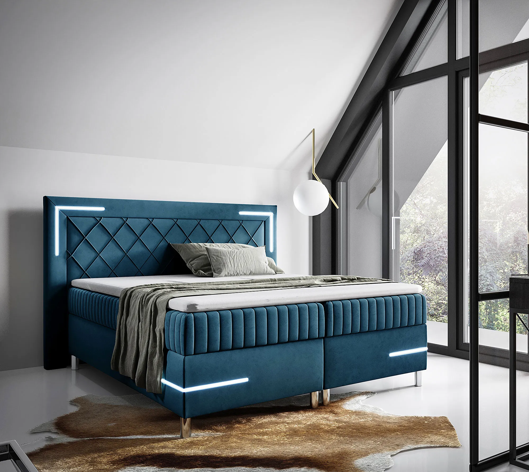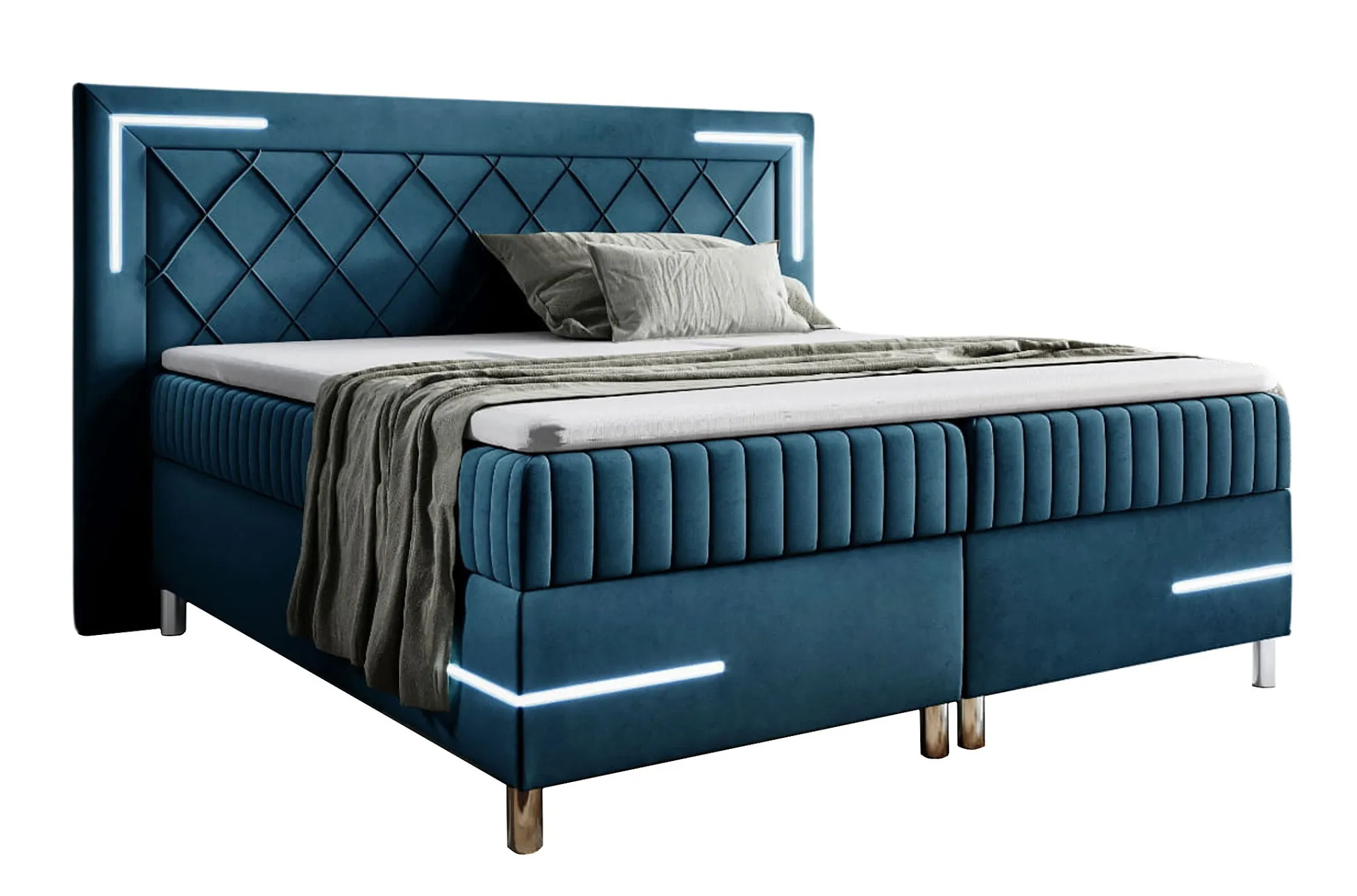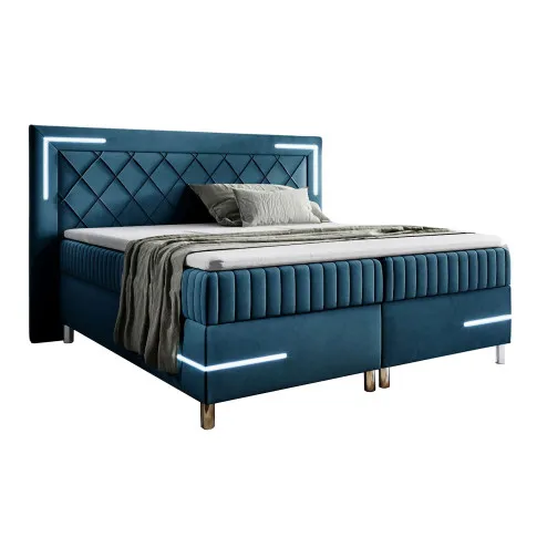 Niebieskie łóżko kontynentalne z oświetleniem LED 5 rozmiarów - Solterro