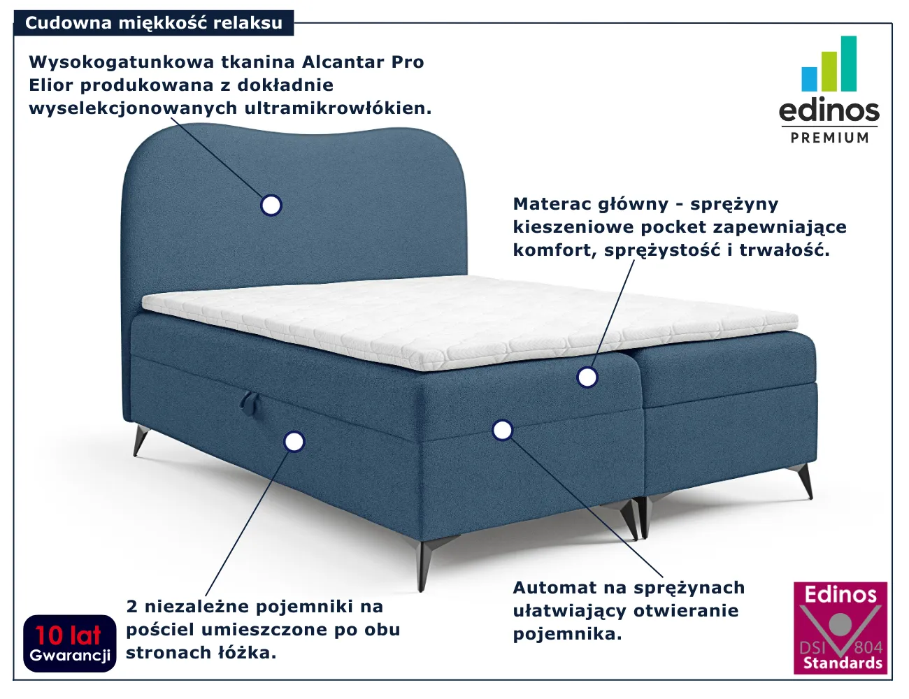 • Produkt posiada certyfikat jakości "Edinos Standards DSI 804", który potwierdza najwyższą jakość wykonania mebla oraz pełny stopień zgodności poszczególnych jednostek wytworzonego wyrobu z przyjętym wzorcem.