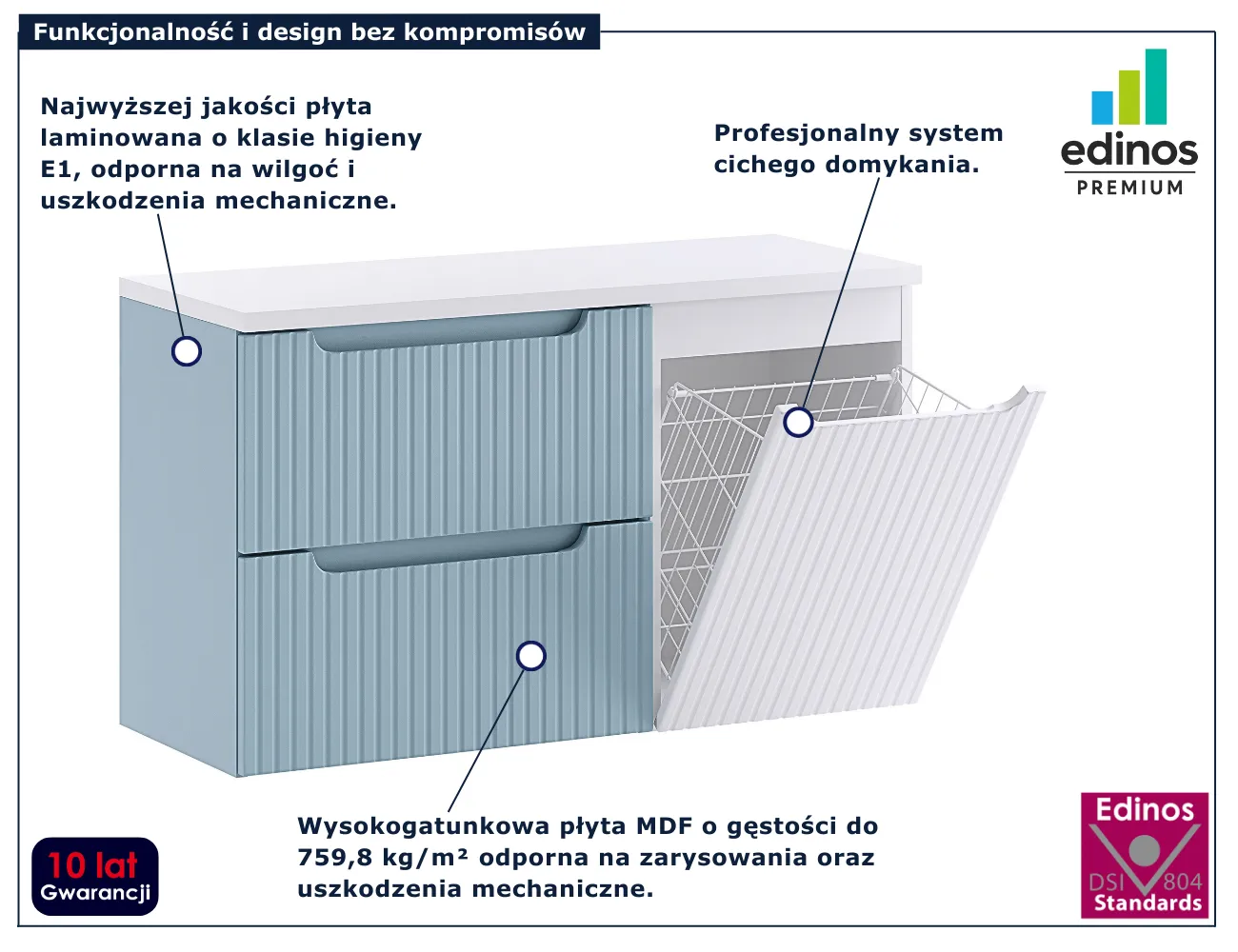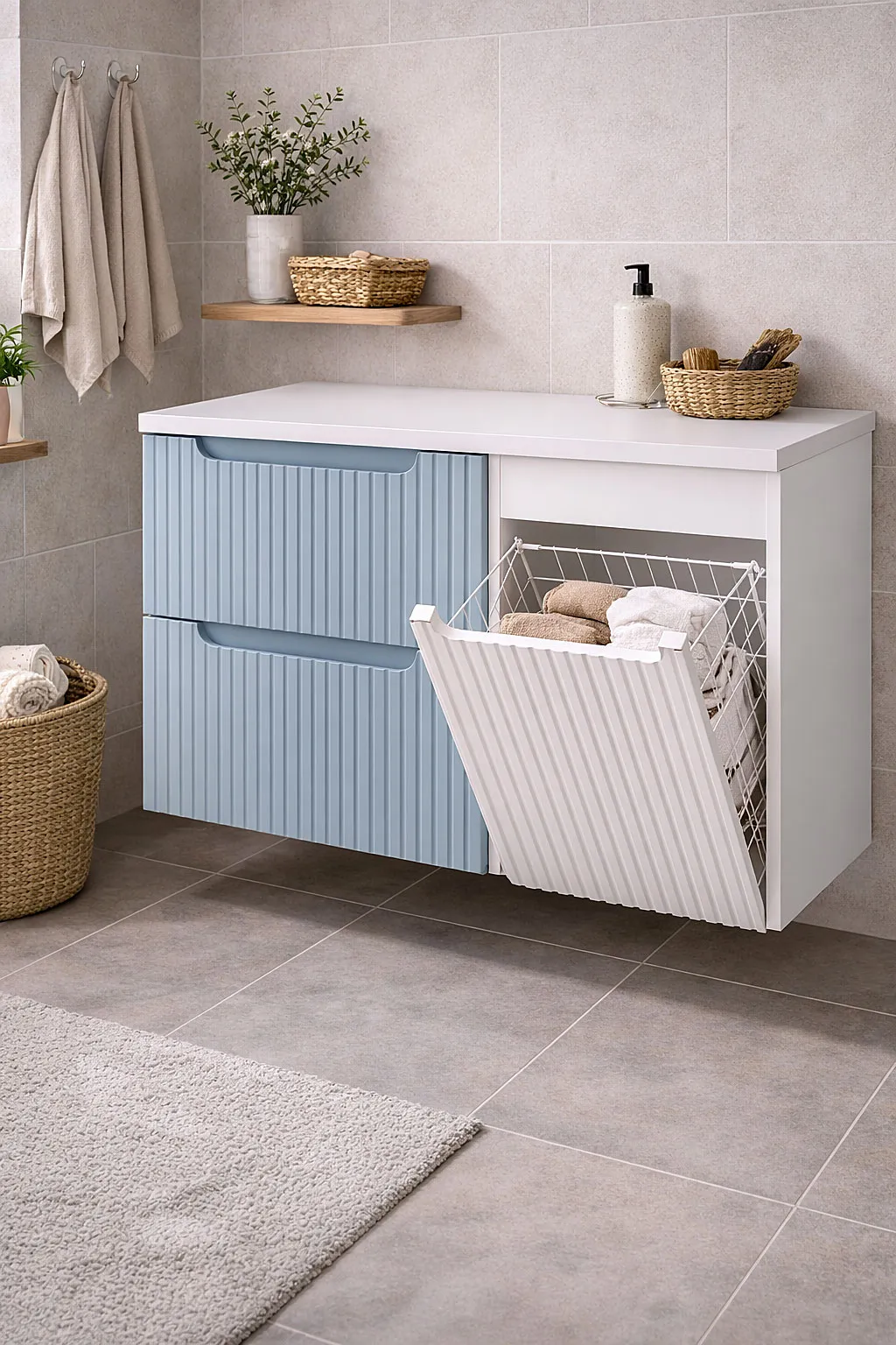 Szafka łazienkowa z koszem na pranie Arvessi 9X marki Edinos Premium to nowoczesne i niezwykle praktyczne rozwiązanie, które pozwala zachować porządek nawet w intensywnie użytkowanej łazience. Zawieszana bryła łączy funkcję przechowywania kosmetyków z dyskretnie ukrytym koszem na pranie, dzięki czemu codzienne obowiązki stają się wygodniejsze, a wnętrze pozostaje estetyczne i uporządkowane. Pionowe ryflowania frontów w zestawieniu z jasnym wykończeniem tworzą lekką, świeżą kompozycję, idealnie wpisującą się w nowoczesne aranżacje.