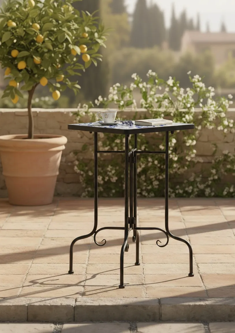 Główna część produktu Neve to blat, którego powierzchnię tworzą ceramiczne płytki o przyjemnej w dotyku fakturze w kolorze błękitu i bieli. Tę mozaikową górę można nazwać małym dziełem sztuki, które kojarzy się z kulturą grecką. Wykonano ją z pojedynczych elementów, które starannie ze sobą połączono. Wyglądają one nie tylko bardzo oryginalnie, ale są też niezwykle łatwe w czyszczeniu. Do utrzymania ich w czystości wystarczy bowiem wilgotna szmatka. Poza tym są odporne na każde warunki pogodowe. Warto również wiedzieć, że stolik Neve z powodzeniem sprawdzi się również jako kwietnik. To świetna oprawa dla Twoich ulubionych kwiatów i roślin doniczkowych. Dzięki niej zaaranżujesz ogród, taras lub patio, nadając Twojej przestrzeni szczyptę południowego charakteru. Stolik mozaikowy Neve wykańcza natomiast żelazna, oryginalna podstawa odporna na duży nacisk i uszkodzenia mechaniczne, którą zabezpieczono także przed korozją. Te eleganckie gięte nogi sprawiają, że całość konstrukcji jest niezwykle trwała i stabilna. Co więcej, fantazyjna podstawa utrzymana w ponadczasowej czerni będzie pasować do innych dodatków, z którymi zestawisz ten produkt.