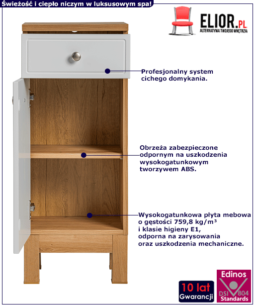 Potrzebujesz miejca w łazience na wszystkie złowione w drogerii skarby? Masz dość ciągłego poszukiwania ulubionego kremu między środkami czystości? Wykorzystaj szafkę łazienkową Hektos 3X od marki Elior do stworzenia przestrzeni tylko dla siebie! Dzięki stosunkowo niewielkim rozmiarom nie przytłoczy ona Twojej aranżacji, a uzupełni ją w doskonały sposób. Uwaga - zamawiając ją już teraz zapłacisz jedyne 498 zł zamiast 498 zł! Nie czekaj, to doskonała okazja!