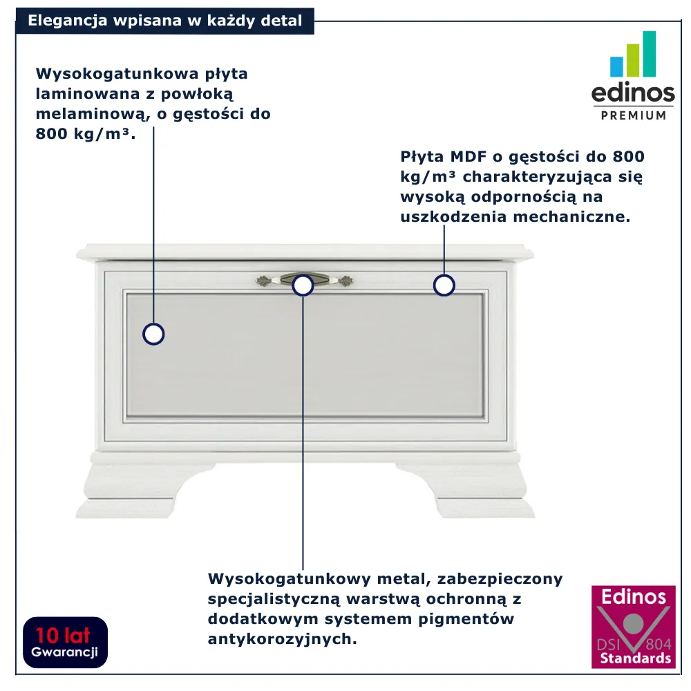 • Produkt posiada certyfikat jakości "Edinos Standards DSI 804", który potwierdza najwyższą jakość wykonania mebla oraz pełny stopień zgodności poszczególnych jednostek wytworzonego wyrobu z przyjętym wzorcem.