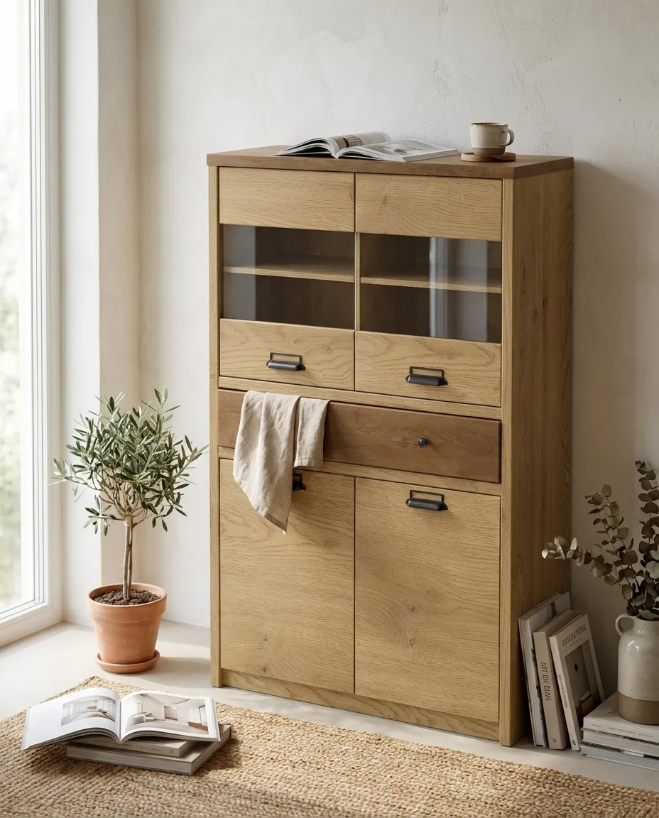 • Górna część z przeszklonym frontem idealnie nadaje się do prezentowania dekoracji i ulubionych dodatków.