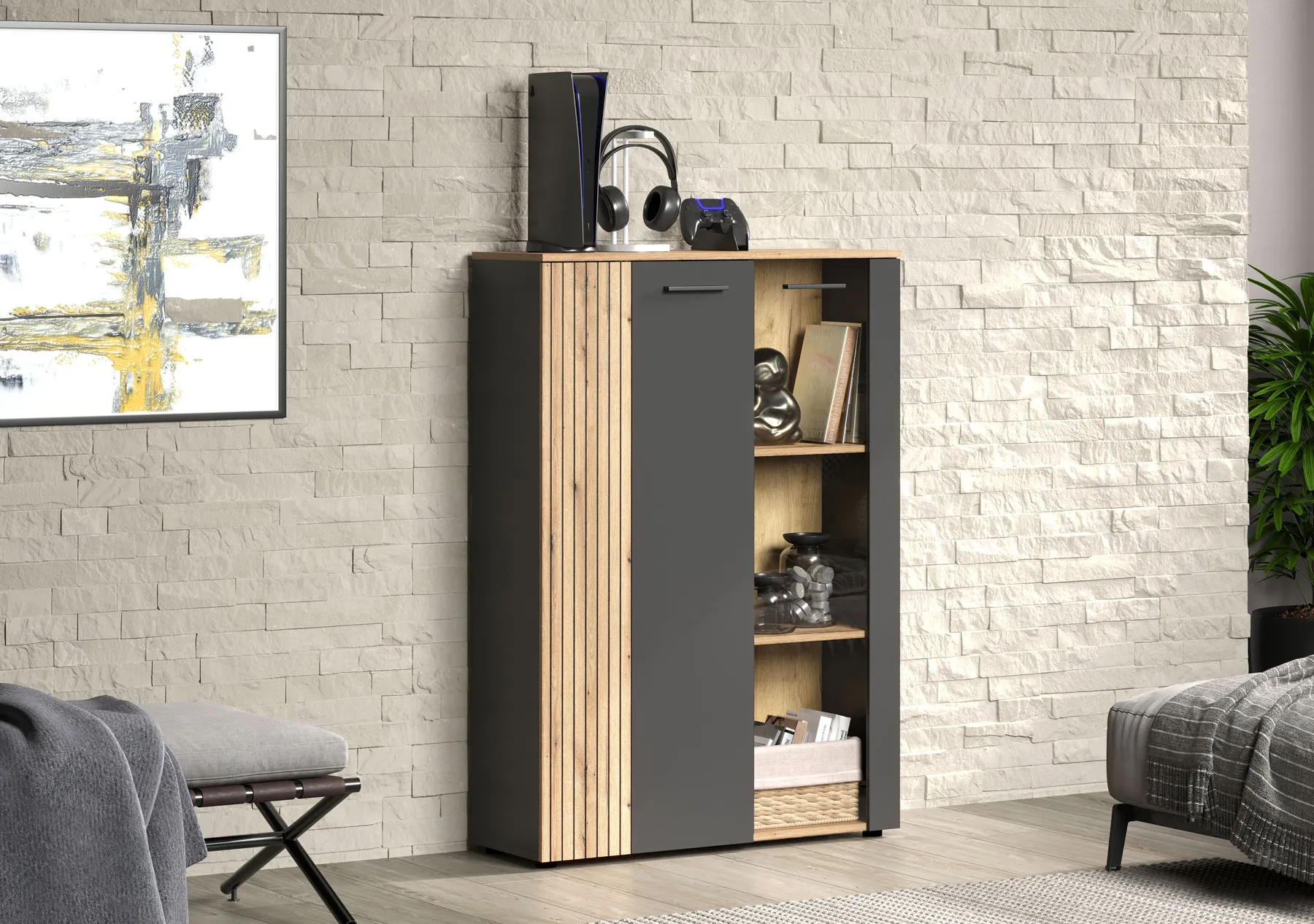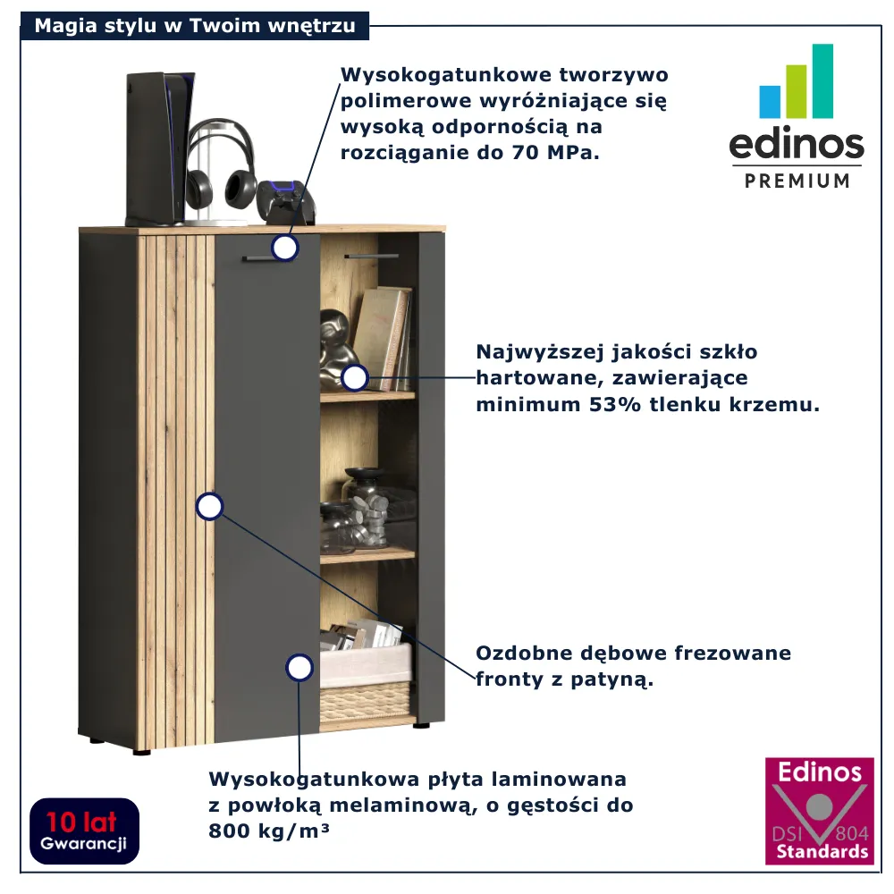 Niska witryna Assoni 16X marki Edinos Premium to mebel, który łączy w sobie elegancję, praktyczne przechowywanie i możliwość subtelnej ekspozycji dekoracji. Połączenie dekoru dąb evok z grafitowymi frontami oraz charakterystycznym ryflowaniem tworzy ponadczasową kompozycję, która pięknie dopełni każde nowoczesne wnętrze. Przeszklona część witryny pozwala na estetyczne wyeksponowanie ulubionych dodatków, a zamknięte segmenty pomagają zachować porządek w codziennym użytkowaniu. To propozycja, która odnajdzie się zarówno w salonie, jak i jadalni czy gabinecie.