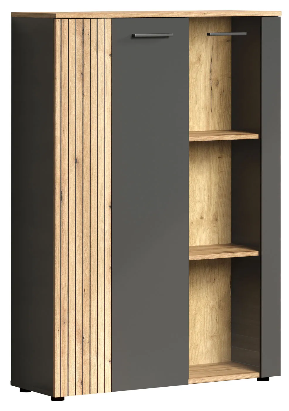 Niska witryna nowoczesna do salonu z lamelami grafit + dąb evok - Assoni 16X