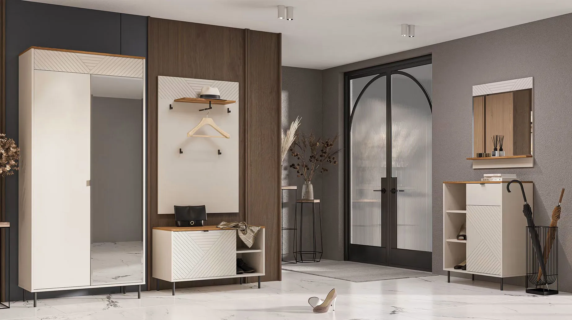 Przedpokój z wykorzystaniem mebli z kolekcji Fiassi kaszmir + dąb castello