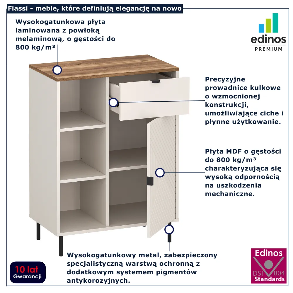 • Produkt posiada certyfikat jakości "Edinos Standards DSI 804", który potwierdza najwyższą jakość wykonania mebla oraz pełny stopień zgodności poszczególnych jednostek wytworzonego wyrobu z przyjętym wzorcem.