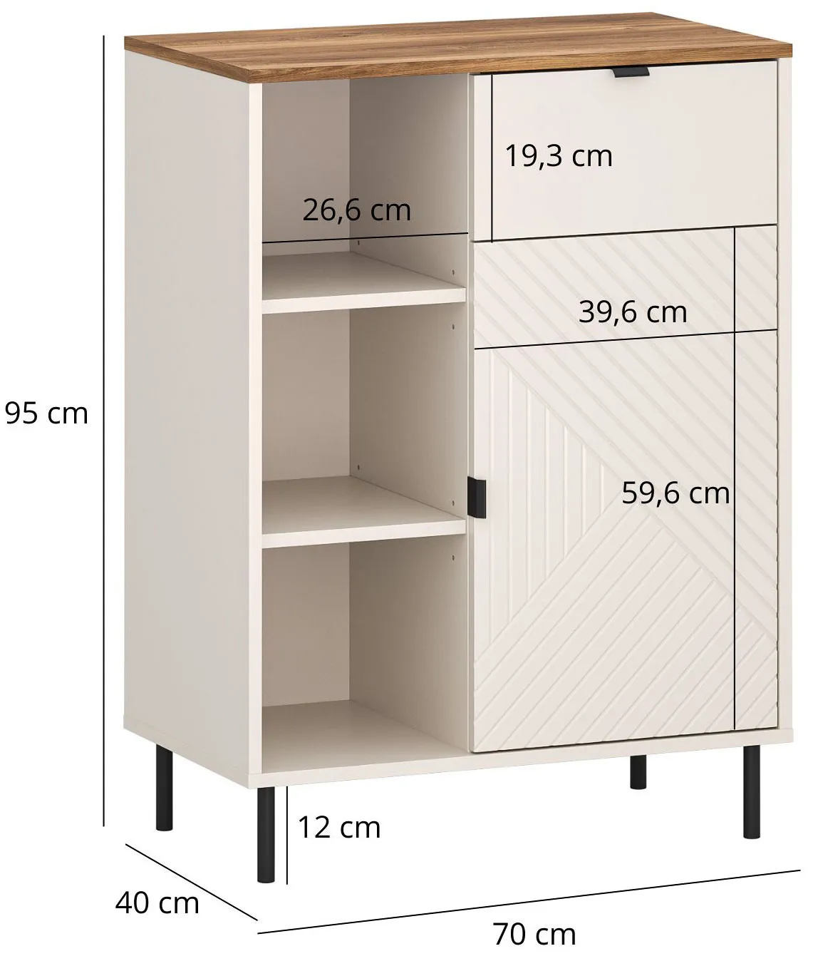 • Szerokość: 70 cm, wysokość: 95 cm, głębokość 40 cm.