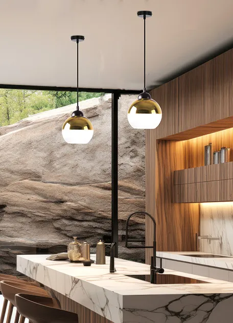 Lampa wisząca D235-Calme to niezwykle stylowy i przyciągający wzrok dodatek do Twojego wnętrza. Stalowa podstawa gwarantuje stabilność i trwałość, podczas gdy szklany klosz wprowadza charakter i elegancję do pomieszczenia. Dwukolorowy klosz w połączeniu z czarną podstawą tworzy niebanalny i wyrafinowany design. Lampa ta doskonale oświetli kuchnię, jadalnię lub salon, jednocześnie pełniąc funkcję dekoracyjną. D235-Calme to propozycja dla osób ceniących sobie nieszablonowe rozwiązania, które przykuwają wzrok i nadają wnętrzom niepowtarzalny styl.