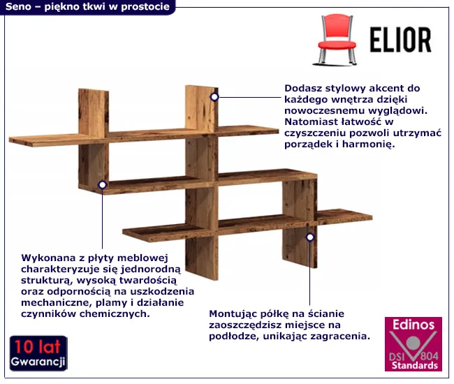 Wkraczasz do swojego salonu i zamiast zwykłej, nudnej ściany widzisz wyjątkowy element dekoracyjny, który także pomaga w organizacji przestrzeni. Półka Norto marki Edinos Premium doskonale wpisuje się w nowoczesny styl, zamieniając każdą pustą ścianę w funkcjonalne i estetyczne centrum Twojego wnętrza. Przemyślany design sprawia, że każdy przedmiot codziennego użytku ma swoje miejsce, a Ty cieszysz się harmonią i porządkiem. Montaż na ścianie pozwala na optymalne wykorzystanie przestrzeni, dzięki czemu podłoga zostaje wolna od zagracających mebli. Wyobraź sobie, jak łatwo zyskać dodatkowe miejsce na swoje ulubione książki, dekoracje czy pamiątki, jednocześnie nadając pomieszczeniu charakteru.