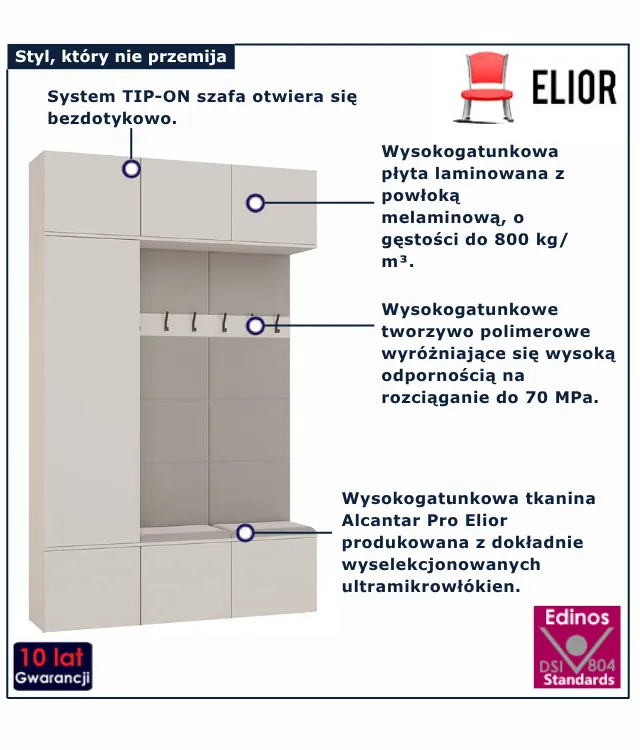 Nowoczesna przestrzeń potrzebuje praktycznych i estetycznych rozwiązań. Szafa Texi 6X marki Edinos Premium to połączenie minimalistycznej formy z przemyślaną konstrukcją, która sprawdzi się zarówno w przedpokoju, jak i w sypialni. Texi 10X to elegancki zestaw garderobiany, który łączy pojemność z komfortem codziennego użytkowania. W jego skład wchodzi przestronna szafa z drążkiem, półkami i wygodnie podzielonymi strefami przechowywania, a także dwa moduły z otwartym panelem wieszakowym, tapicerowanym siedziskiem i dolnymi szafkami. Taki układ doskonale sprawdzi się w przedpokoju, zapewniając miejsce zarówno na odzież wierzchnią, jak i buty, torby czy dodatki. Bezuchwytowe fronty z systemem TIP-ON podkreślają minimalistyczny charakter mebla, a tapicerowane elementy dodają mu przytulności i wygody. Texi 10X to przemyślane rozwiązanie dla tych, którzy chcą utrzymać porządek w strefie wejściowej, nie rezygnując z nowoczesnego stylu i maksymalnej funkcjonalności. Texi 10X to doskonały wybór dla osób ceniących porządek, estetykę i trwałość. Marka Edinos Premium zadbała o każdy detal – od materiałów po wykończenie, abyś mógł cieszyć się codzienną wygodą przez długie lata.