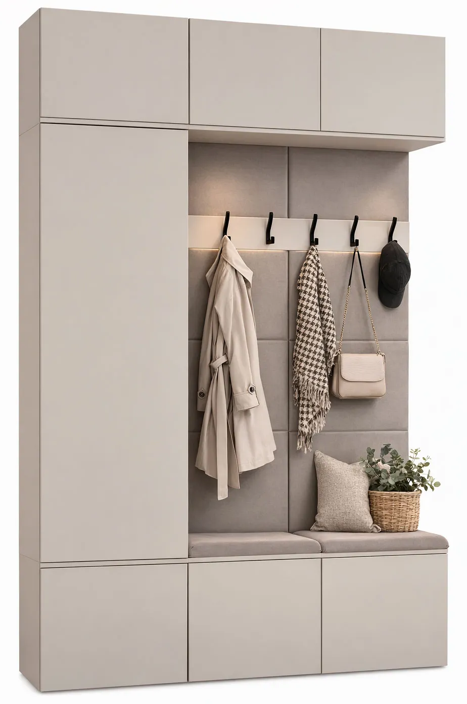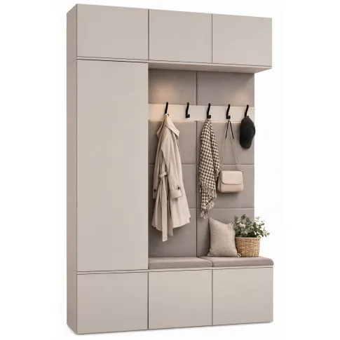 • Pionowy panel z elegancko rozmieszczonymi wieszakami oferuje łatwy i szybki dostęp do odzieży wierzchniej, gwarantując porządek oraz wygodę w każdej chwili dnia.