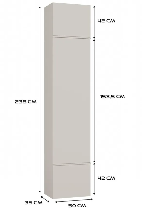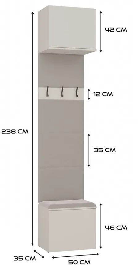• Wymiary całkowite: wysokość: 238 cm, szerokość:szerokość: 150 cm (2 wieszaki po 50 cm + szafa 50 cm), głębokość: 35 cm.