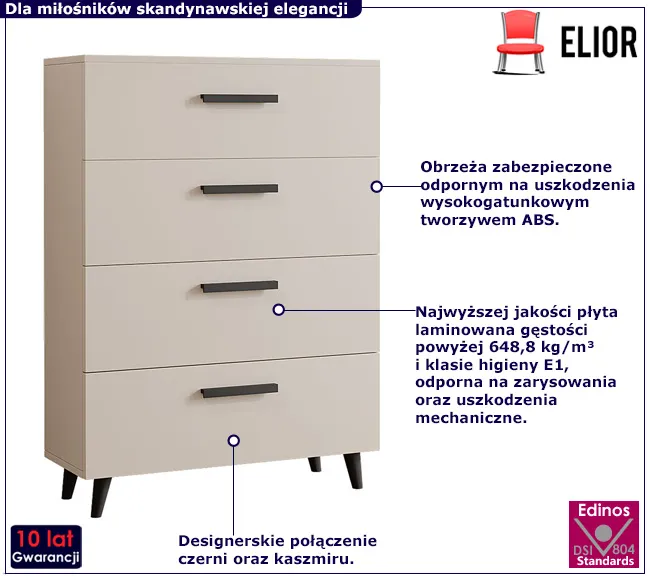 - Kolor: kaszmirowy. Kliknij w link i sprawdź także inne komody z 4 szufladami w sklepie Edinos.pl. Stwórz swój praktyczny zestaw mebli.