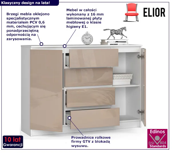 Dotyczy: Komoda do salonu z gładkim frontem biała + metalik połysk - Liv 4X 140 cm