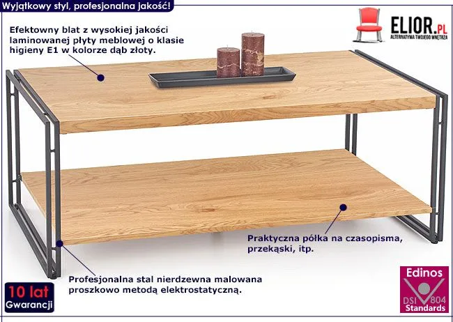 - Kolor: Blaty mebla w kolorze dąb złoty, konstrukcja czarna. Kliknij w link i sprawdź także inne prostokątne ławy w sklepie Edinos.pl. Stwórz swój praktyczny zestaw mebli.