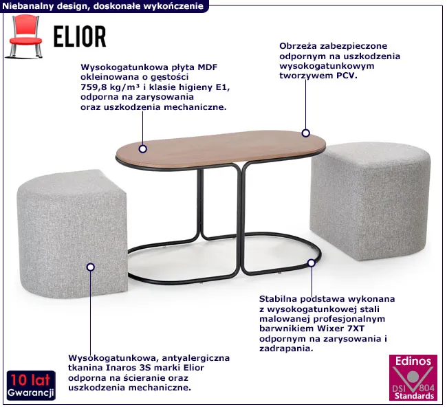 Stolik powstał z naturalnej płyty meblowej zbudowanej z włókien drzewnych i związków organicznych w warunkach wysokiego ciśnienia i temperatury. Włókna ułożone są różnokierunkowo, o strukturze sinusoidalnej, co zapewnia nadanie jej cech jakościowych oraz wytrzymałościowych. Dodatkowo płyta została uszlachetniona cienkimi filmami melaminowymi w celu zwiększenia jej trwałości. Brzegi mebla oklejono specjalistycznym materiałem ABS, cechującym się ponadprzeciętną odpornością na zarysowania. Profil mebla stworzony jest z najwyższej jakości nierdzewnej stali malowanej odpornym na zarysowania i zadrapania. Tapicerka puf wykonana została z wysokogatunkowej tkaniny obiciowej z kolekcji Inaros 3S - jest to tkanina workowa, grubo tkana, dość surowa w dotyku imitująca naturalny len. Tkanina ta jest antyalergiczna, wolna od substancji szkodliwych w stężeniach mających negatywny wpływ na stan zdrowia człowieka m.in. pestycydów, chlorofenoli, formaldehydu, barwników alergizujących oraz zabronionych barwników azowych.