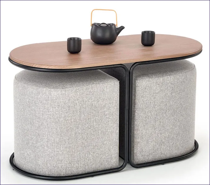 Stolik kawowy Akoja wyróżnia się zarówno praktyczną jak i designerską formą. Gładki i przestronny blat w kolorze szlachetnego orzecha połączony został z czarną, elegancką podstawą tworząc spójną całość o designerskim charakterze. Dzięki specjalnie skonstruowanej podstawie pod blatem mieszczą się dwie szare pufy, co nie tylko podnosi komfort użytkowania, ale także ułatwia utrzymanie porządku we wnętrzu. Dzięki niemu, gdy odwiedzą Cię niespodziewani goście nigdy nie zabraknie dla nich miejsca. Idealnie odnajdzie się we wnętrzach urządzonych w stylu loftowym, skandynawskim, a nawet minimalistycznym.
