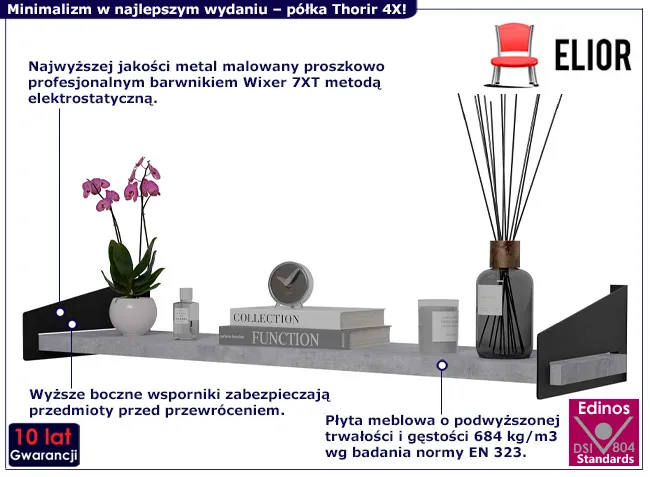 • Kolor: stelaż: czarny mat; półka: beton. Kliknij w link i sprawdź także inne półki metalowe w sklepie Edinos.pl. Stwórz swóją praktyczną przestrzeń.