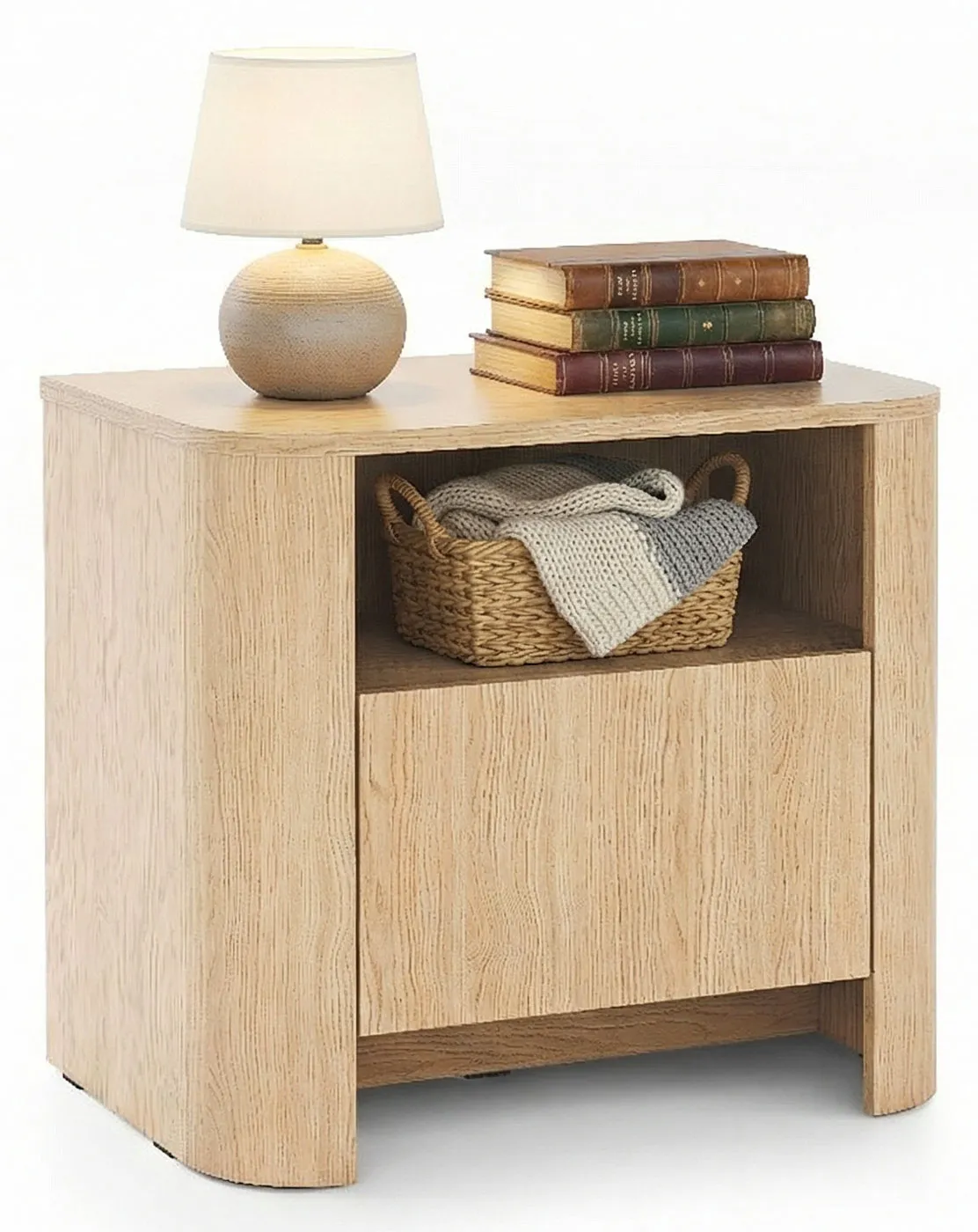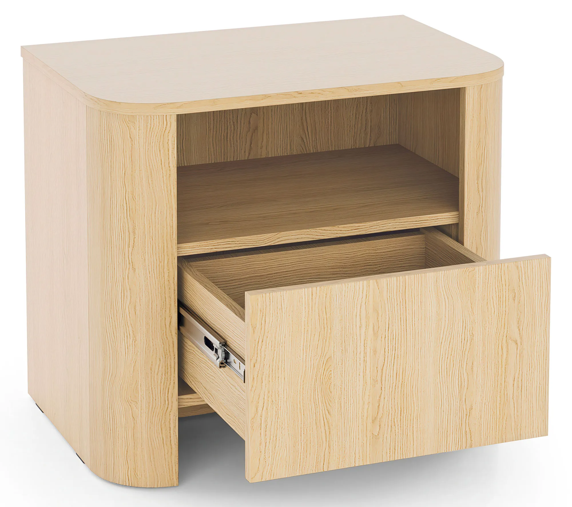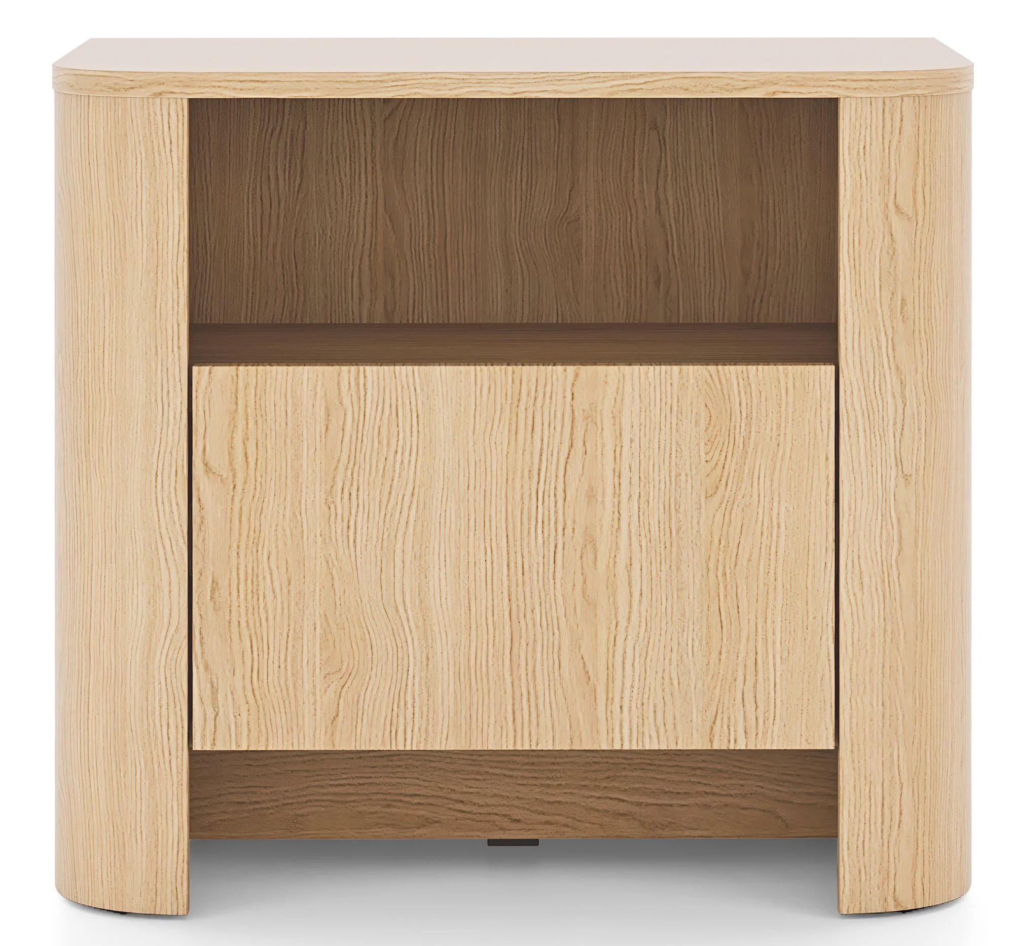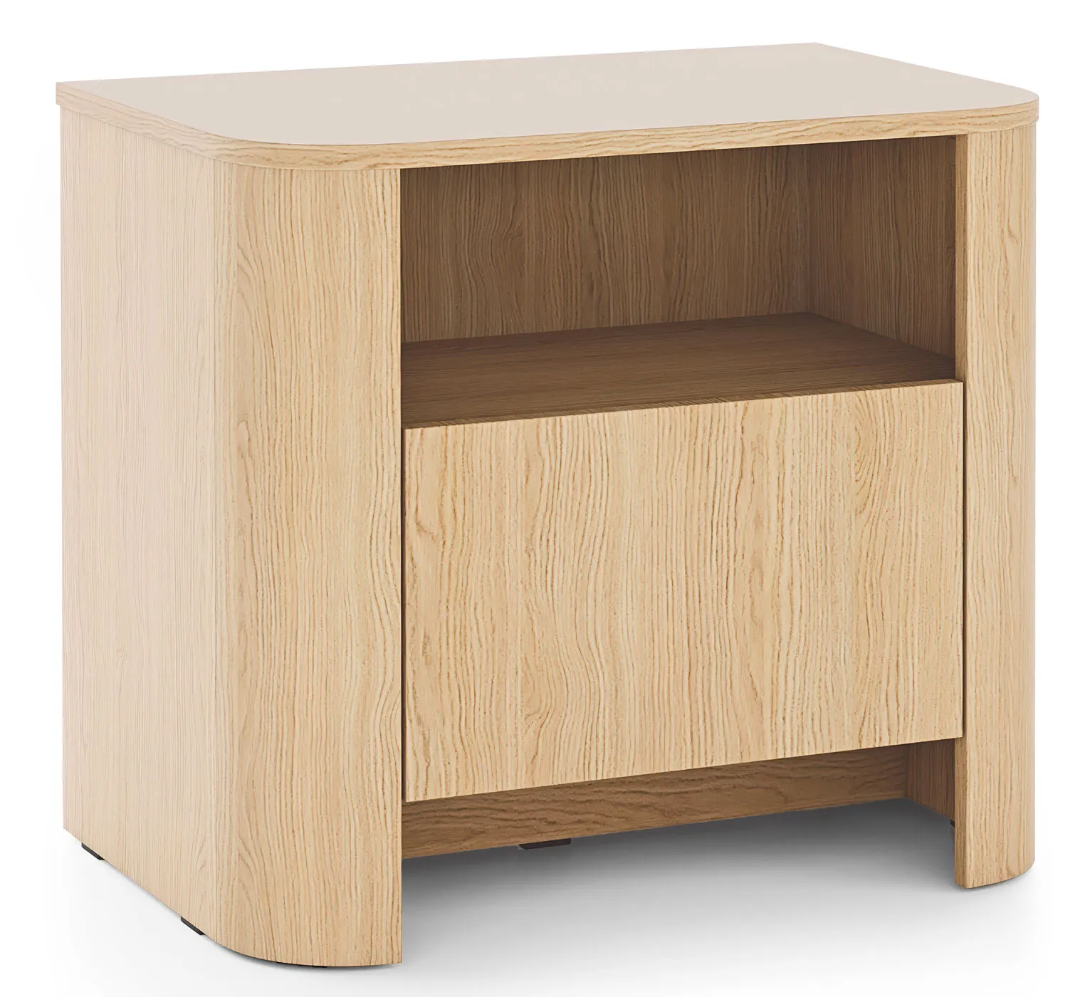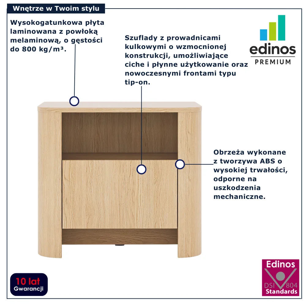 Mała forma, wielkie możliwości – szafka nocna Ebisso 7X marki Edinos Premium to esencja funkcjonalnego minimalizmu w eleganckim wydaniu. Jej zaokrąglona bryła i gładkie, pozbawione uchwytów fronty tworzą harmonijną całość, która świetnie komponuje się z nowoczesnym wnętrzem sypialni. Praktyczna otwarta półka doskonale sprawdzi się na książkę lub telefon, a pojemna szuflada na prowadnicach kulkowych pomieści wszystkie drobne przedmioty, które warto mieć pod ręką. Szafka łączy w sobie prostotę z elegancją, oferując jednocześnie wygodę i przemyślane rozwiązania. To niepozorny, ale niezwykle potrzebny element sypialnianej przestrzeni.